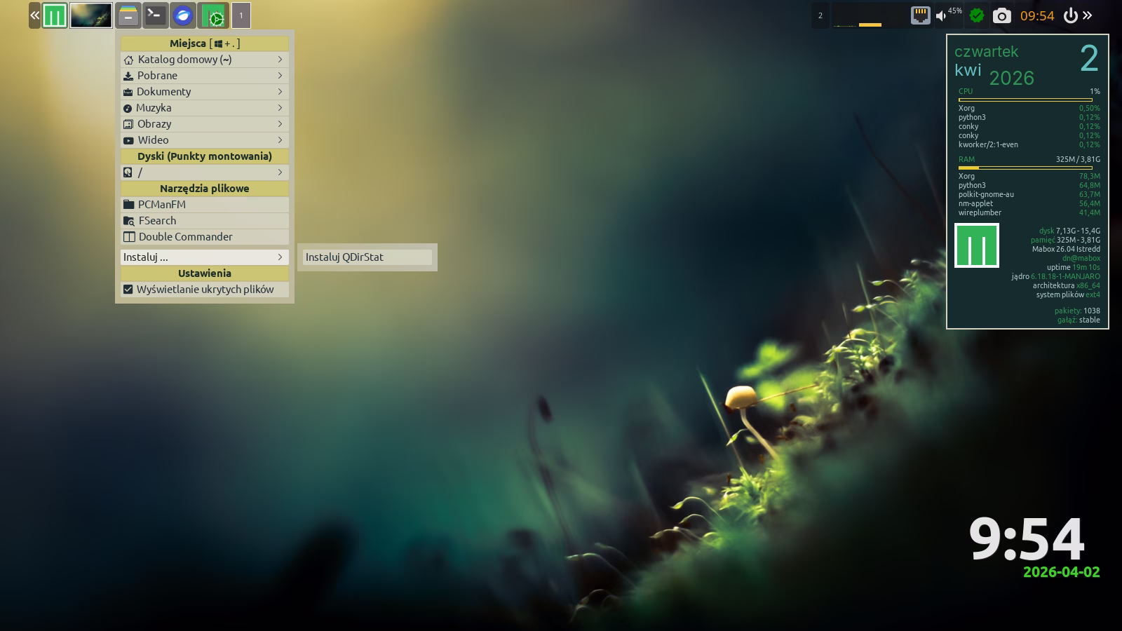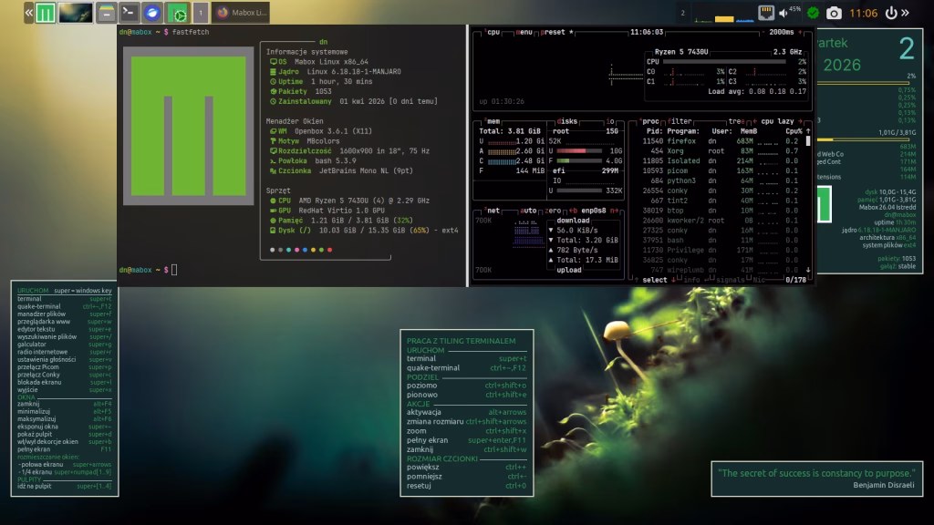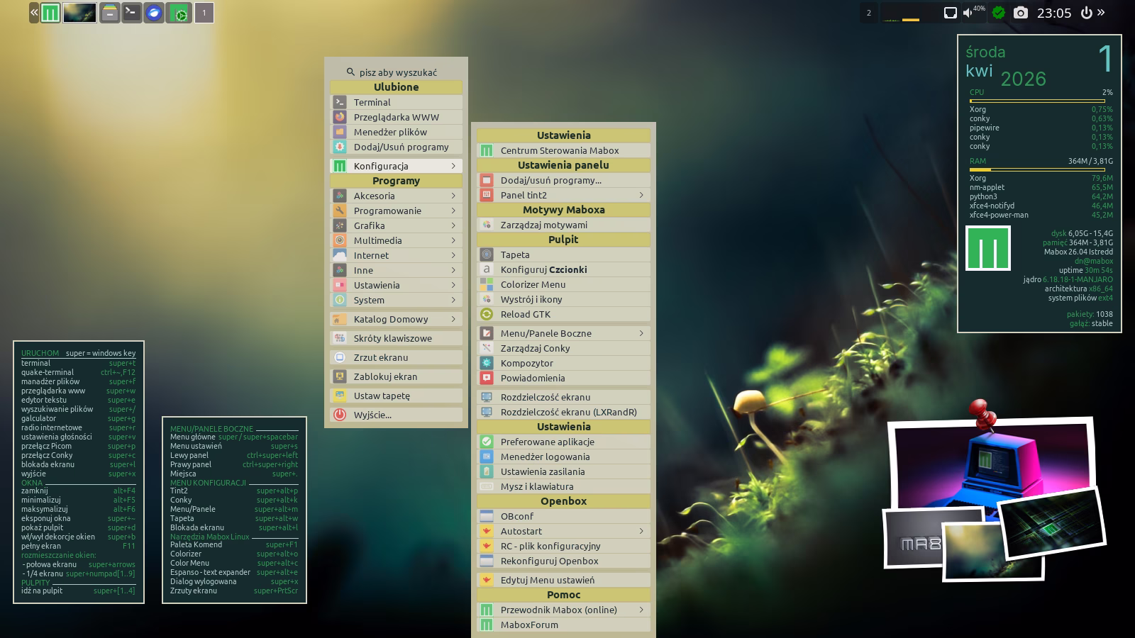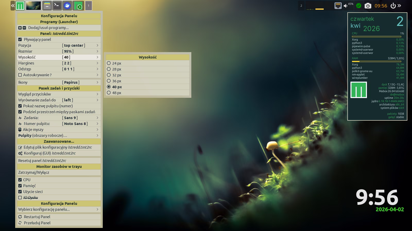 Na górze ekranu znajduje się panel. To nie jest zwykły panel — to Tint2, który oferuje ciekawe możliwości, takie jak akcje wywoływane prawym przyciskiem myszy lub rolką. Sprawdź, które elementy panelu reagują w ten sposób 🙂