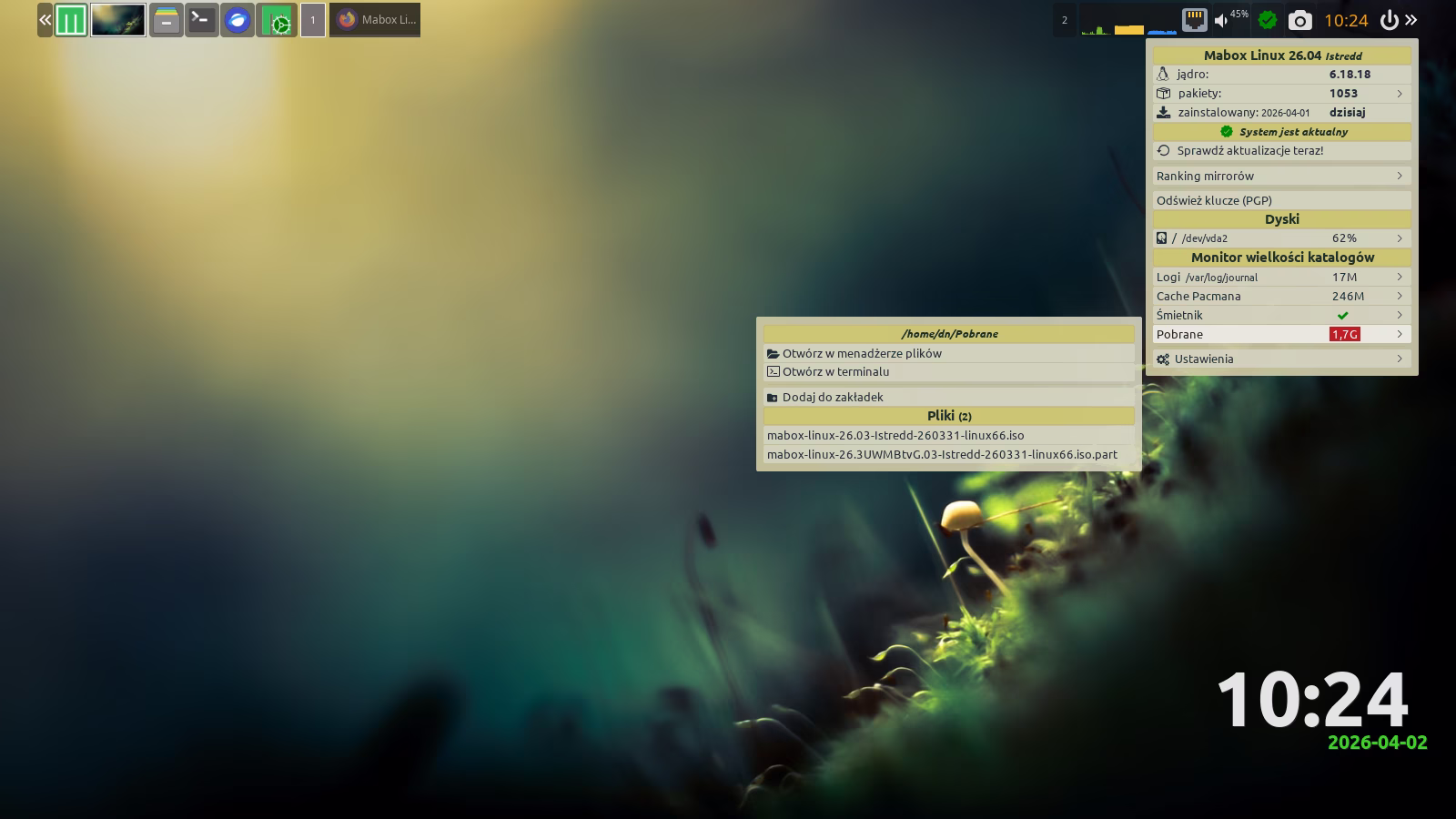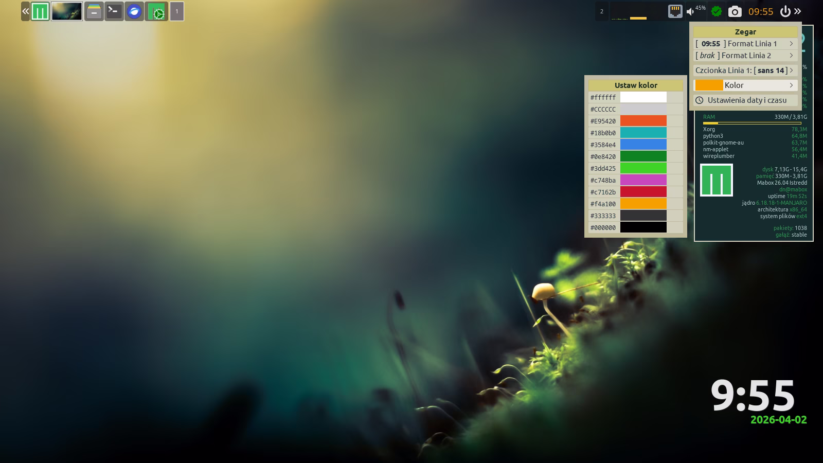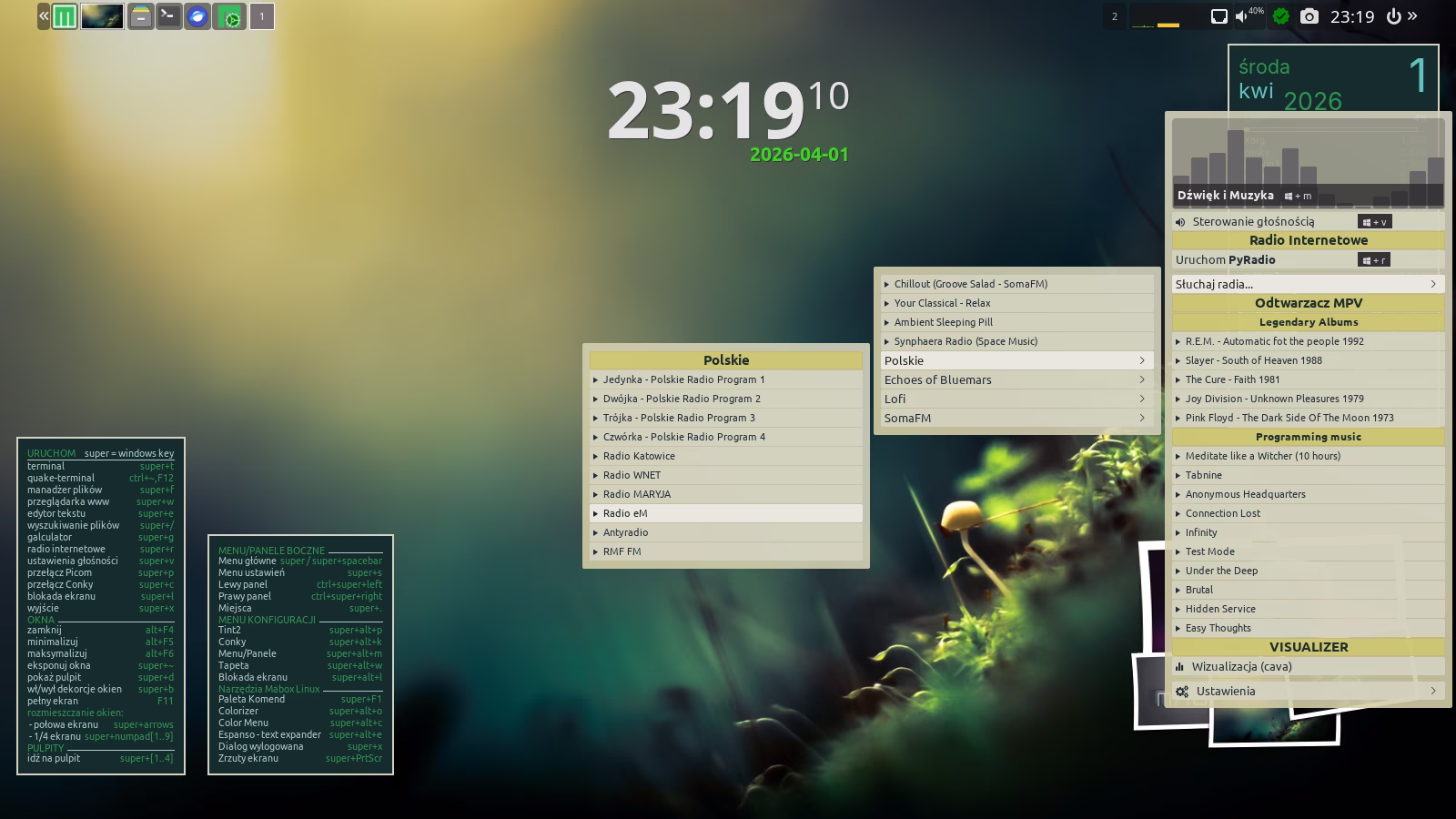 Na górze ekranu znajduje się panel. To nie jest zwykły panel — to Tint2, który oferuje ciekawe możliwości, takie jak akcje wywoływane prawym przyciskiem myszy lub rolką. Sprawdź, które elementy panelu reagują w ten sposób 🙂