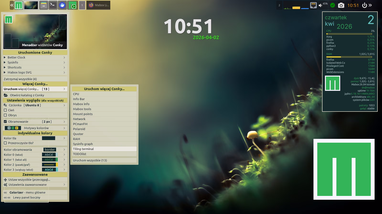 W Maboxie Conky oferuje unikalne możliwości: menu kontekstowe (prawy klik) do sterowania każdym Conky oraz możliwość zdefiniowania programu uruchamianego po kliknięciu lewym przyciskiem myszy.