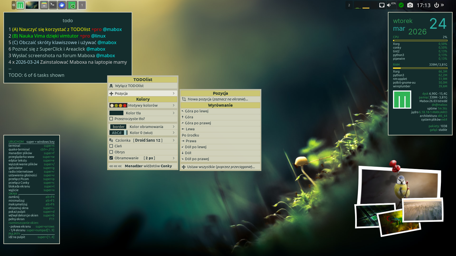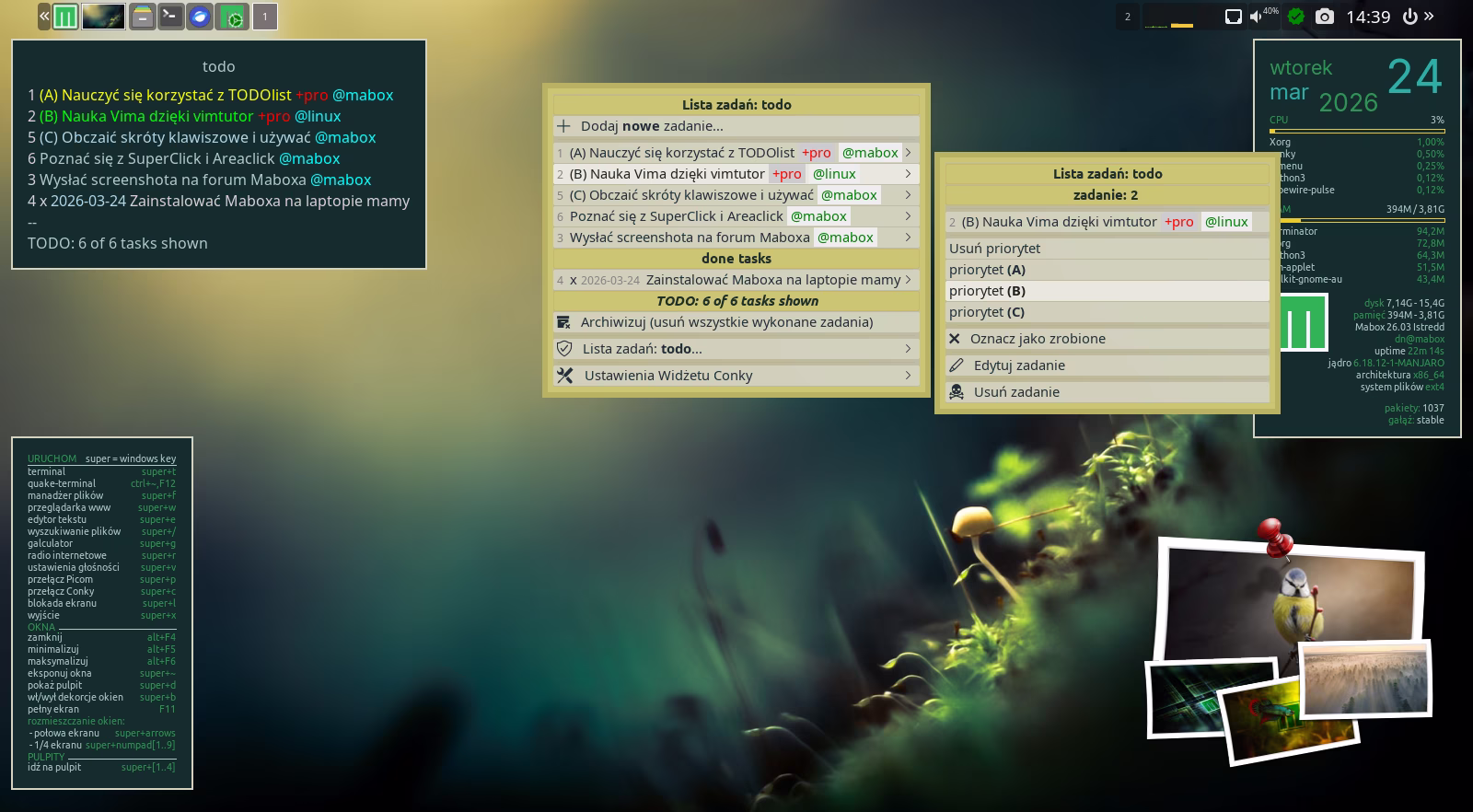 Marcowe wydanie Maboxa 26.03 przynosi udoskonalenia w obsłudze Conky, nowe narzędzie do zarządzania listami zadań oraz łatwiejszy podgląd i edycję skrótów klawiszowych.