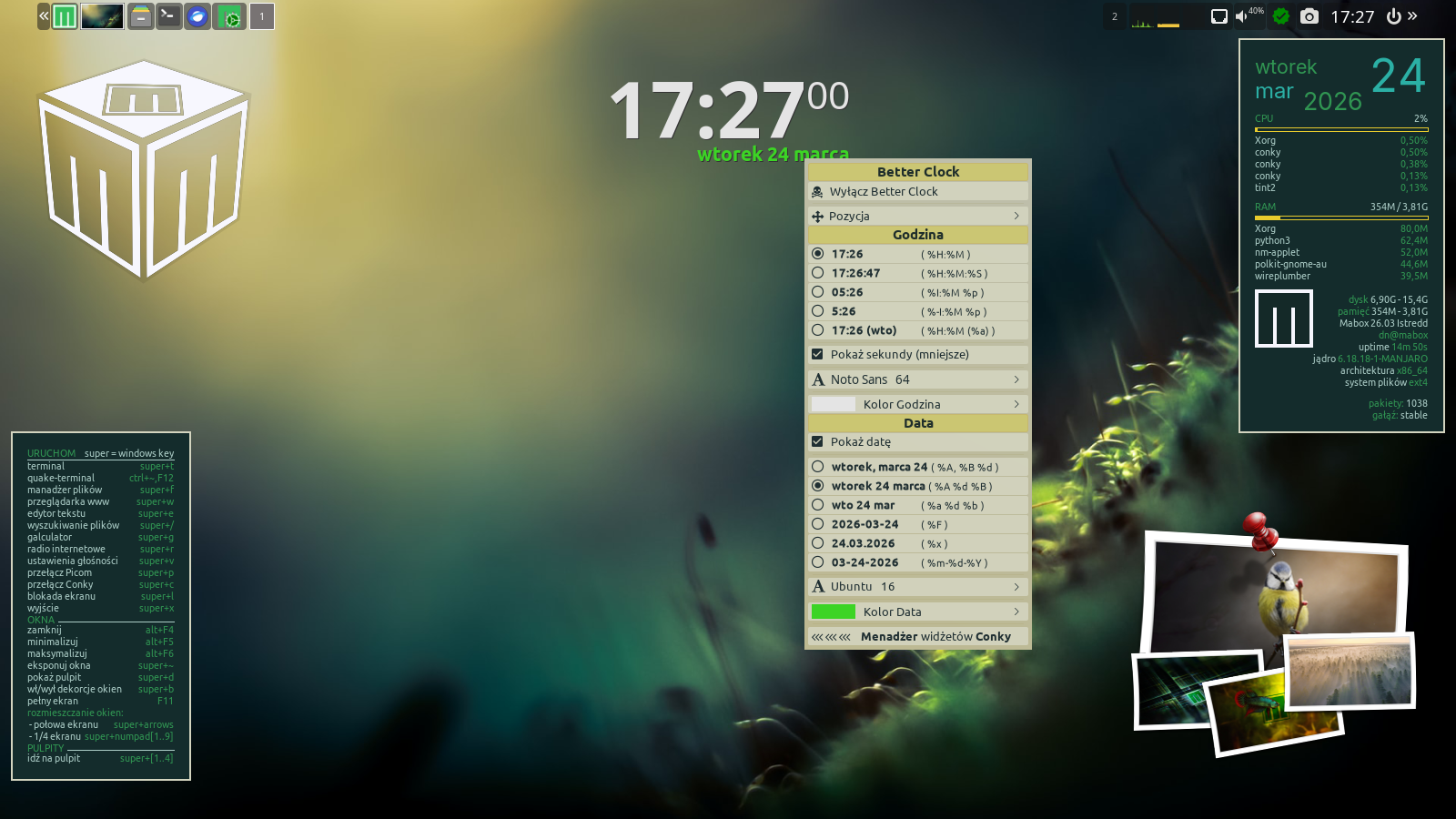 Dostępne po kliknięciu w widżet conky ze skrótami klawiszowymi – w lewym dolnym rogu ekranu.